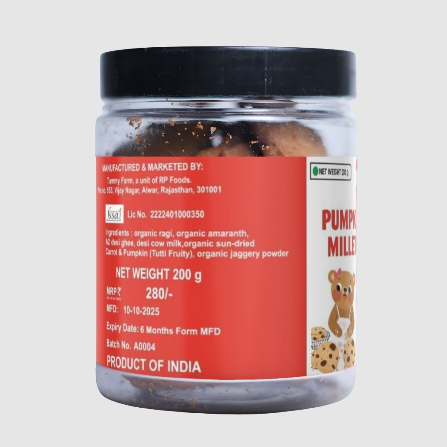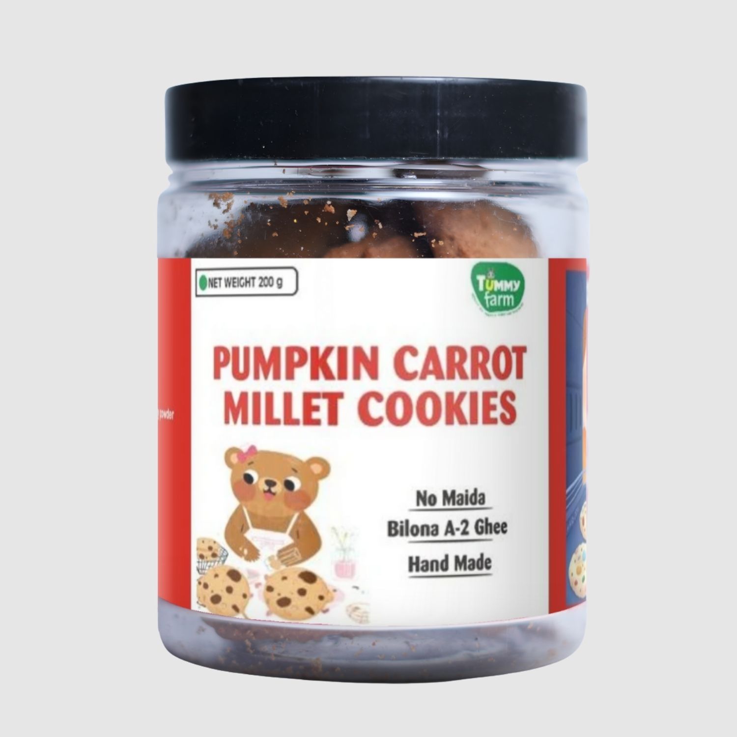 Nutritious meets delicious in Pumpkin & Carrot Multivitamin Millet Cookies—a wholesome snack crafted for growing kids. Made with a powerful mix of ragi, jowar, and barley, and enriched with real pumpkin and carrot, these cookies naturally provide essential vitamins, minerals, and fiber.